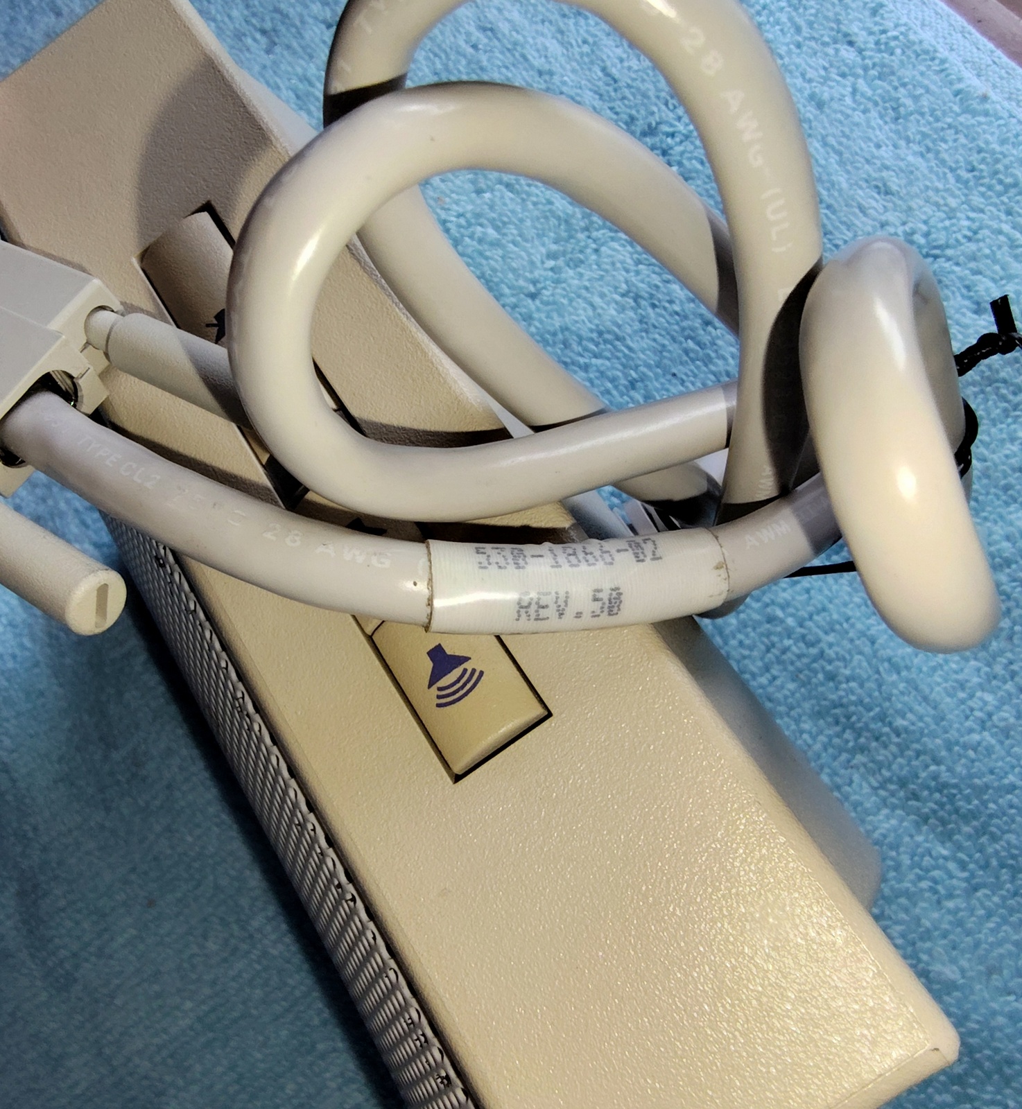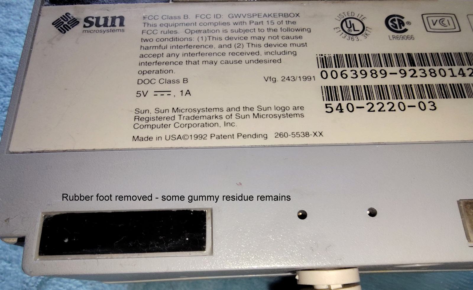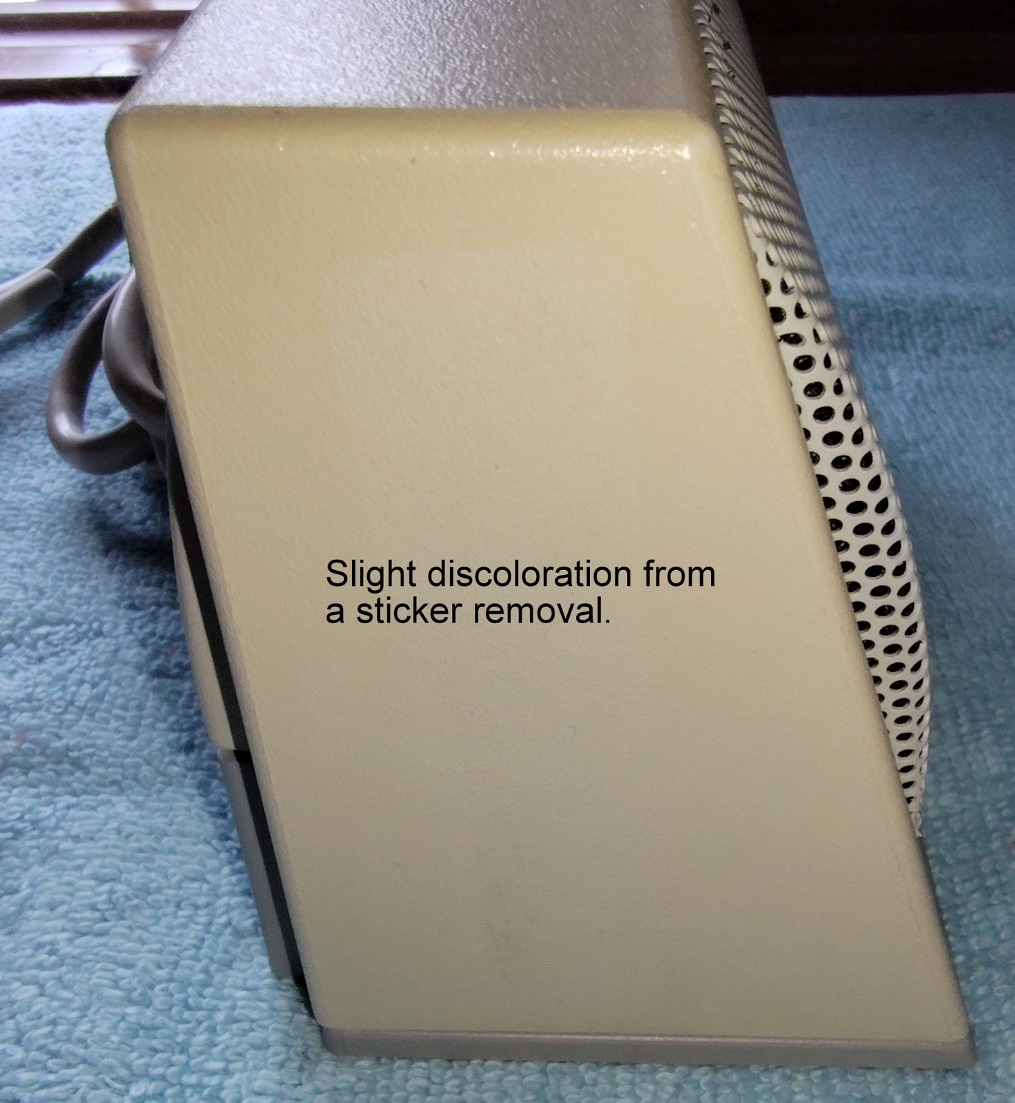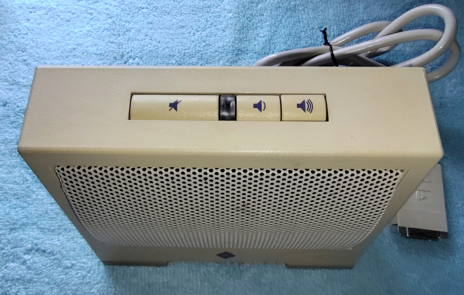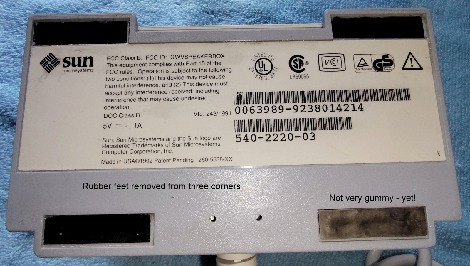 Up for sale is a Sun Microsystems Speaker Box, 540-2220-03. The part number 530-1866-02 Rev. 50 0843-9238 is on a sticker on the cable near the plug. This would have been used with an older Sun Sparc system from the 1990s. This is sold as-is for a collectible only since we have no way to test it and it’s decades old or more. It is in good physical condition with minor scrapes / scratches / smudges, etc. Three of the feet have been removed due to having disintegrated into a gummy mess – LOOK AT THE PICTURES! The remaining original foot is pretty degraded, but not a gummy mess – YET! The next owner of this should plan on putting new feet on it. The buttons all click OK – SEE PICTURES! There is a slight inconsistency in the yellowing of the plastic on one side where there used to be a sticker – LOOK AT THE PICTURES!