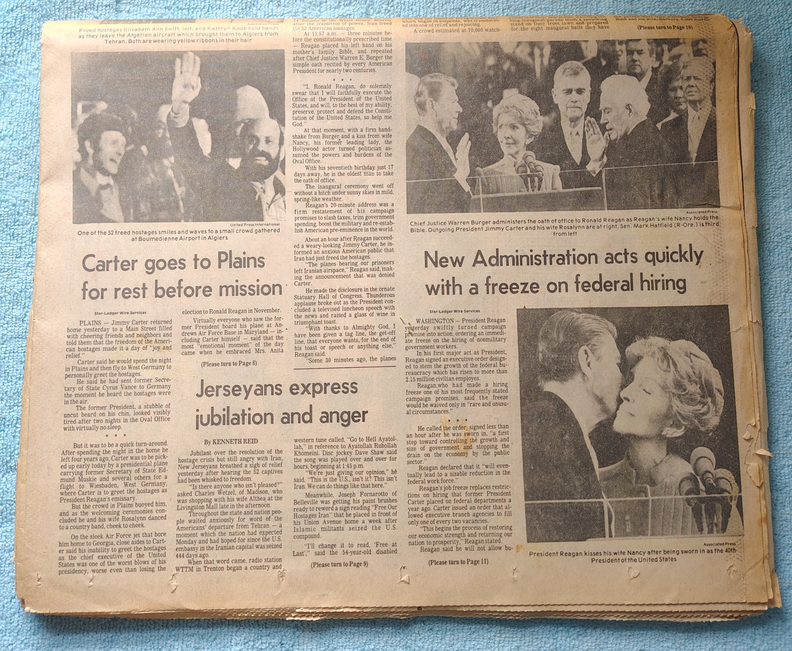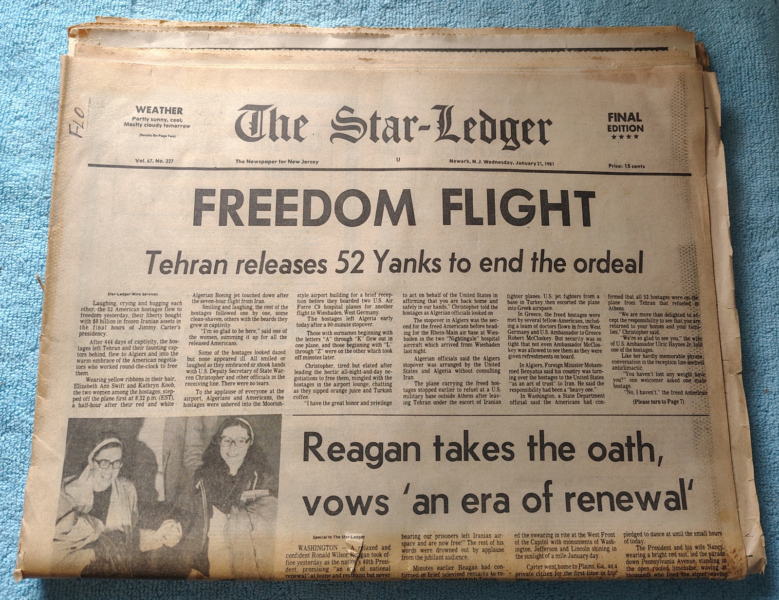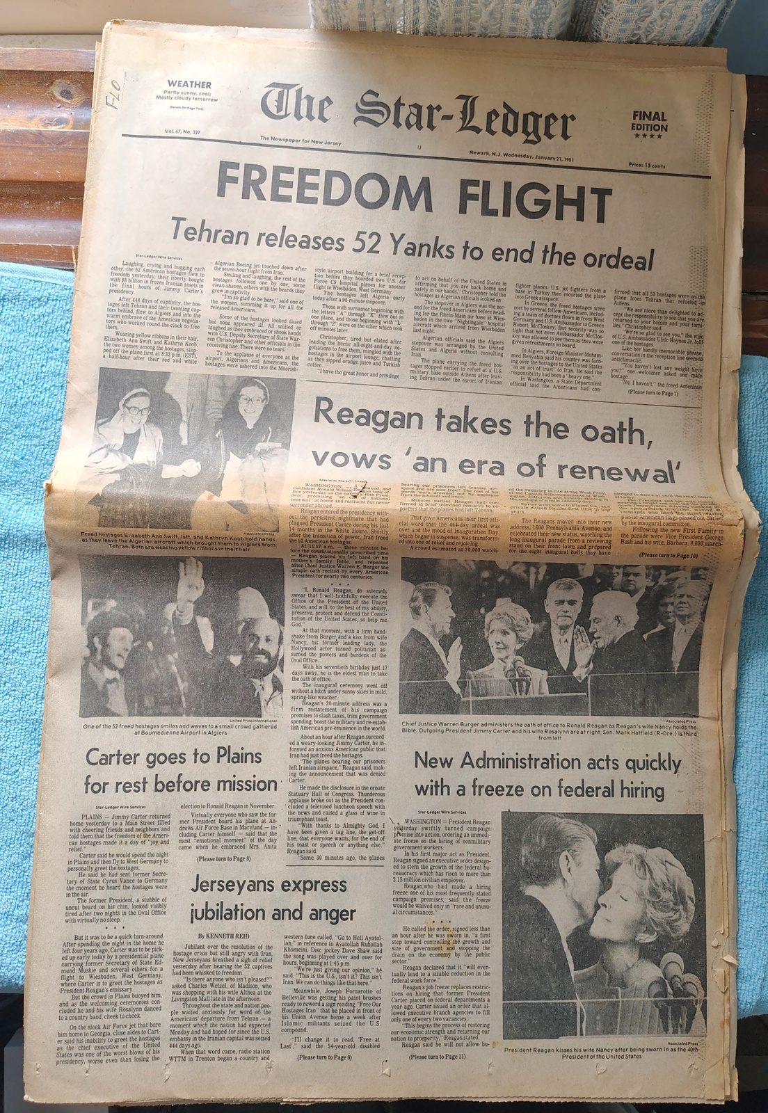 The Star-Ledger from Newark, NJ – Wednesday, January 21, 1981. This old newspaper features on the front page pictures of President Reagan’s inauguration and smiles and waves from the Iranian hostages being released. The headline is: ‘Freedom Flight’ ‘Tehran releases 52 Yanks to end the ordeal’ What you see in the pictures is what you get.
