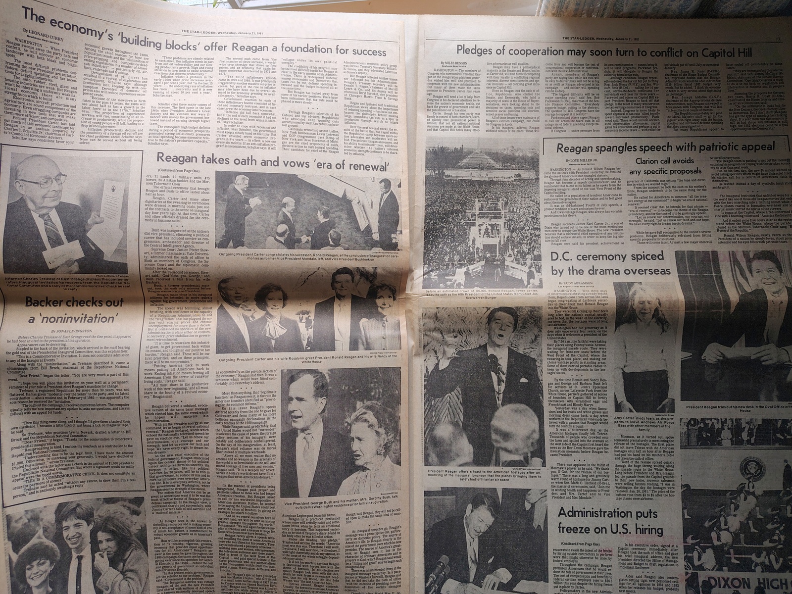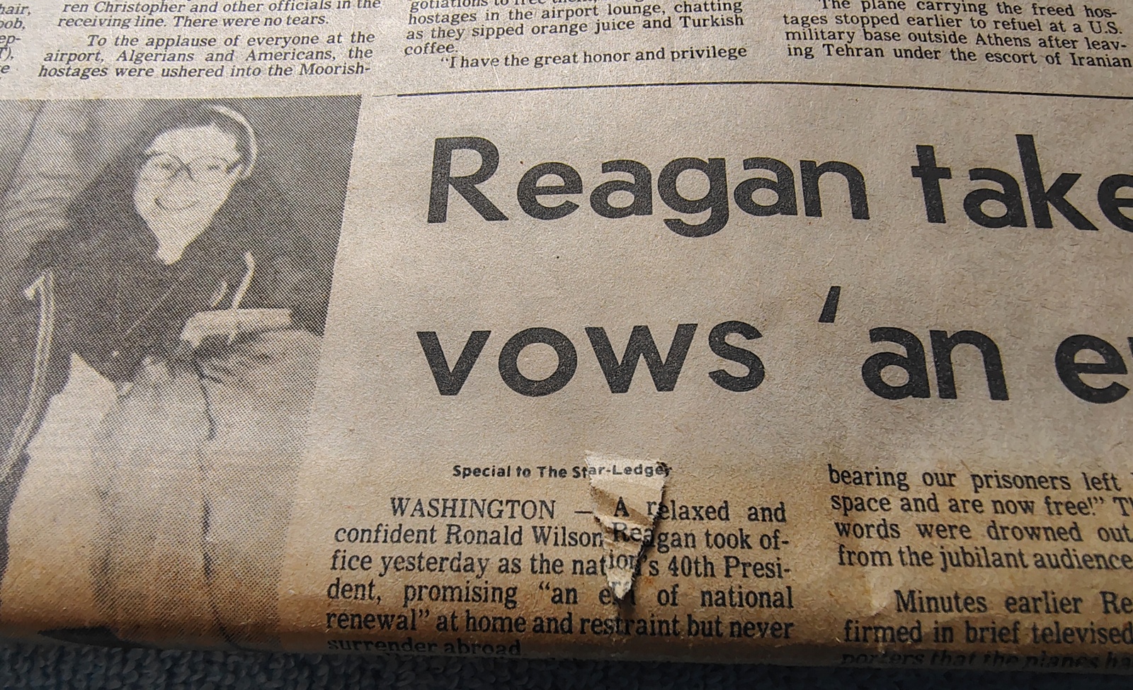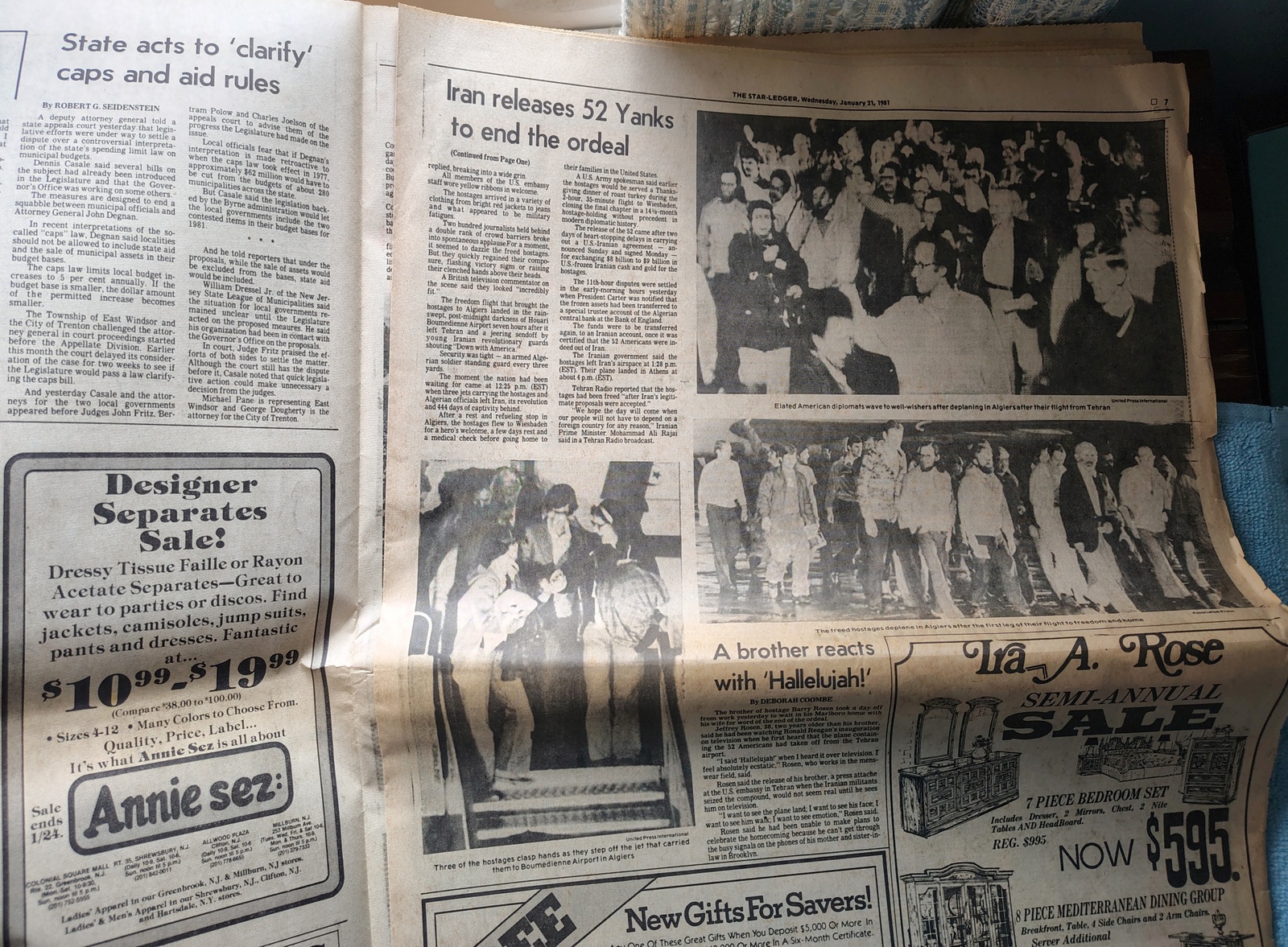 The Star-Ledger from Newark, NJ – Wednesday, January 21, 1981. This old newspaper features on the front page pictures of President Reagan’s inauguration and smiles and waves from the Iranian hostages being released. The headline is: ‘Freedom Flight’ ‘Tehran releases 52 Yanks to end the ordeal’ What you see in the pictures is what you get.