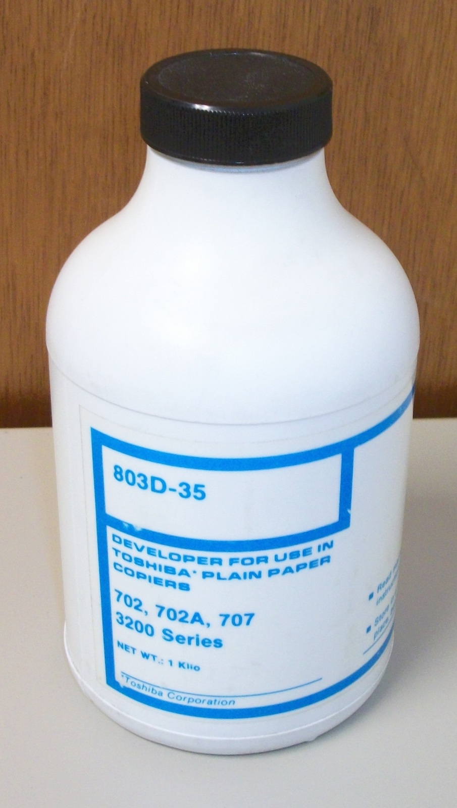 Up for sale is a new, old stock Toshiba 803D-35 Developer Bottle. We hope someone out there on the interwebs can put it to use. It is left over from copiers past and was found in the desk drawer when we were cleaning it out. What you see in the pictures is what you get. Probably made in Japan.