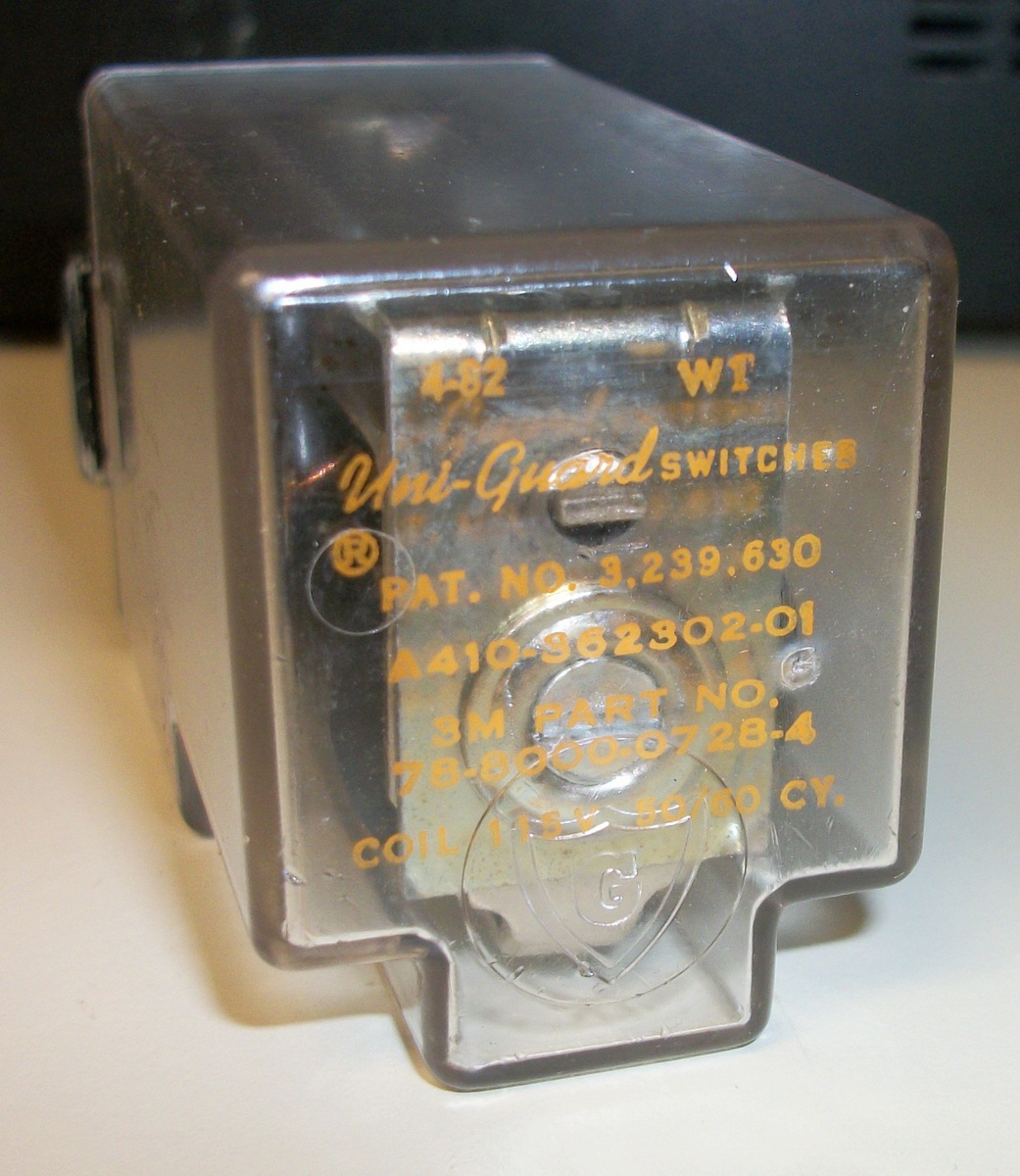 This is new, old stock Uni-Guard relay with a clear plastic case for use with 3M applications for part number 78-8000-0728-4. The retired 3M repair man said this was compatible with model 201 / 295 Microfilm Reader / Printer machines, but we’re not for certain. This may be useful for other electronics projects.