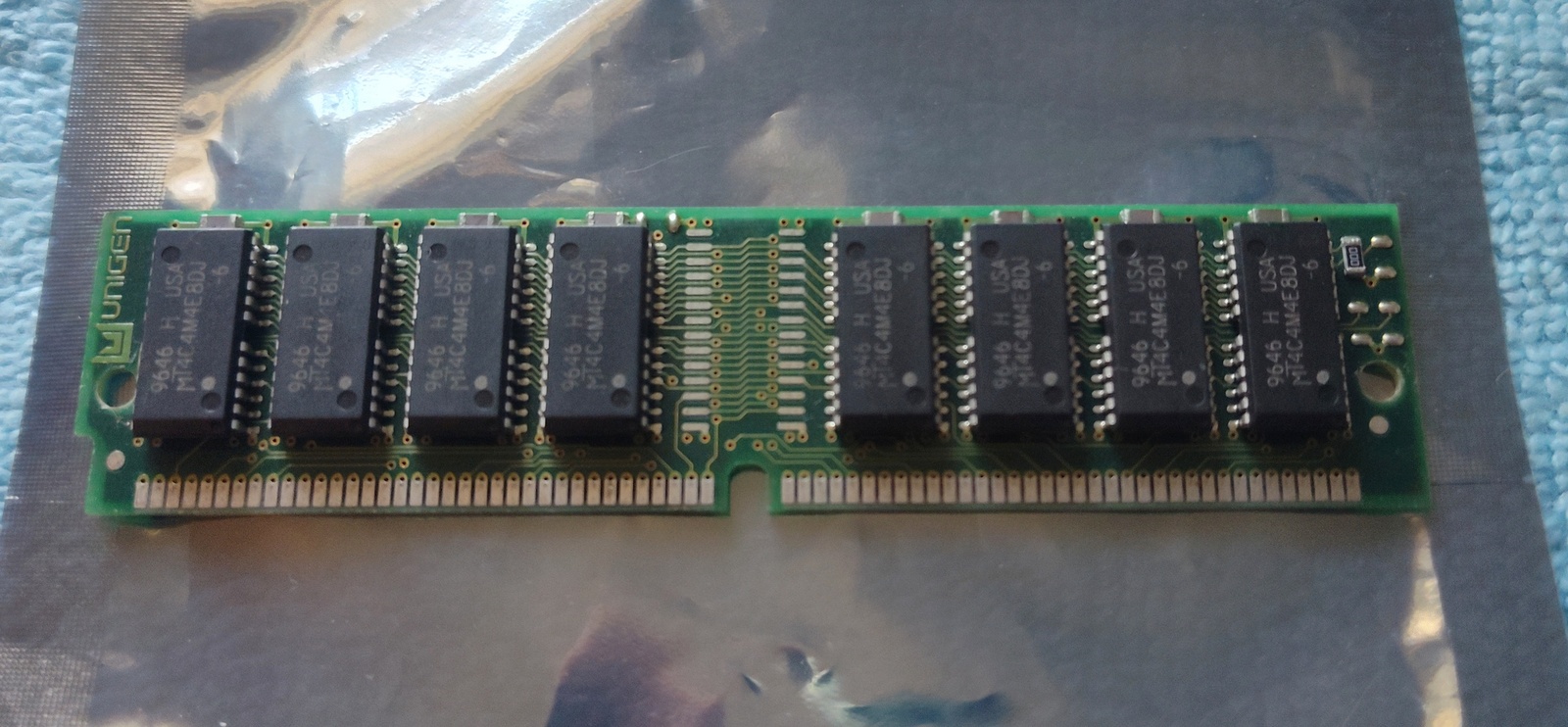 Up for sale is a 16MB 72-pin SIMM of Unigen 60ns Desktop PC Memory RAM. We found this old module in our old computer parts drawer and are now offering it on the internet in the hopes that it can find a loving home in your old computer parts drawer! We don’t know the functional status of this module, but it looks to be in good physical condition. It’s sold AS-IS for a collectible only as it is pushing 30 years old! This has 8 Micron chips on it. Please check with the manufacturer of your computer for compatibility BEFORE you make your decision to purchase. You get one 16MB 72-pin module from the 1990s.