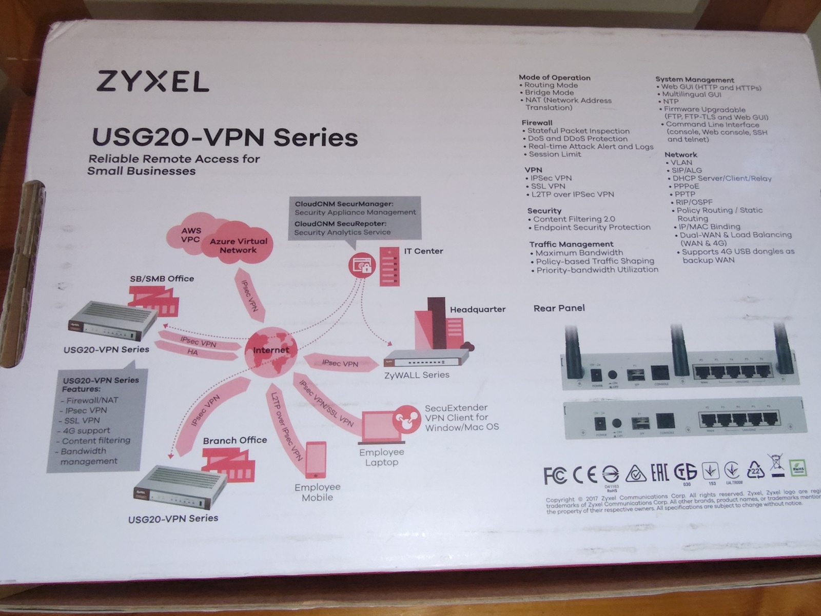 Up for sale is a good used Zyxel USG20W-VPN firewall. We put this one into service in January of 2020 and just retired it in November of 2023. We have replaced it with a newer, faster firewall and now have this one left over. Hope someone out there can put it to use! It has been reset to the defaults and is ready for you to configure as you like. The default username is admin and the default password is 1234.